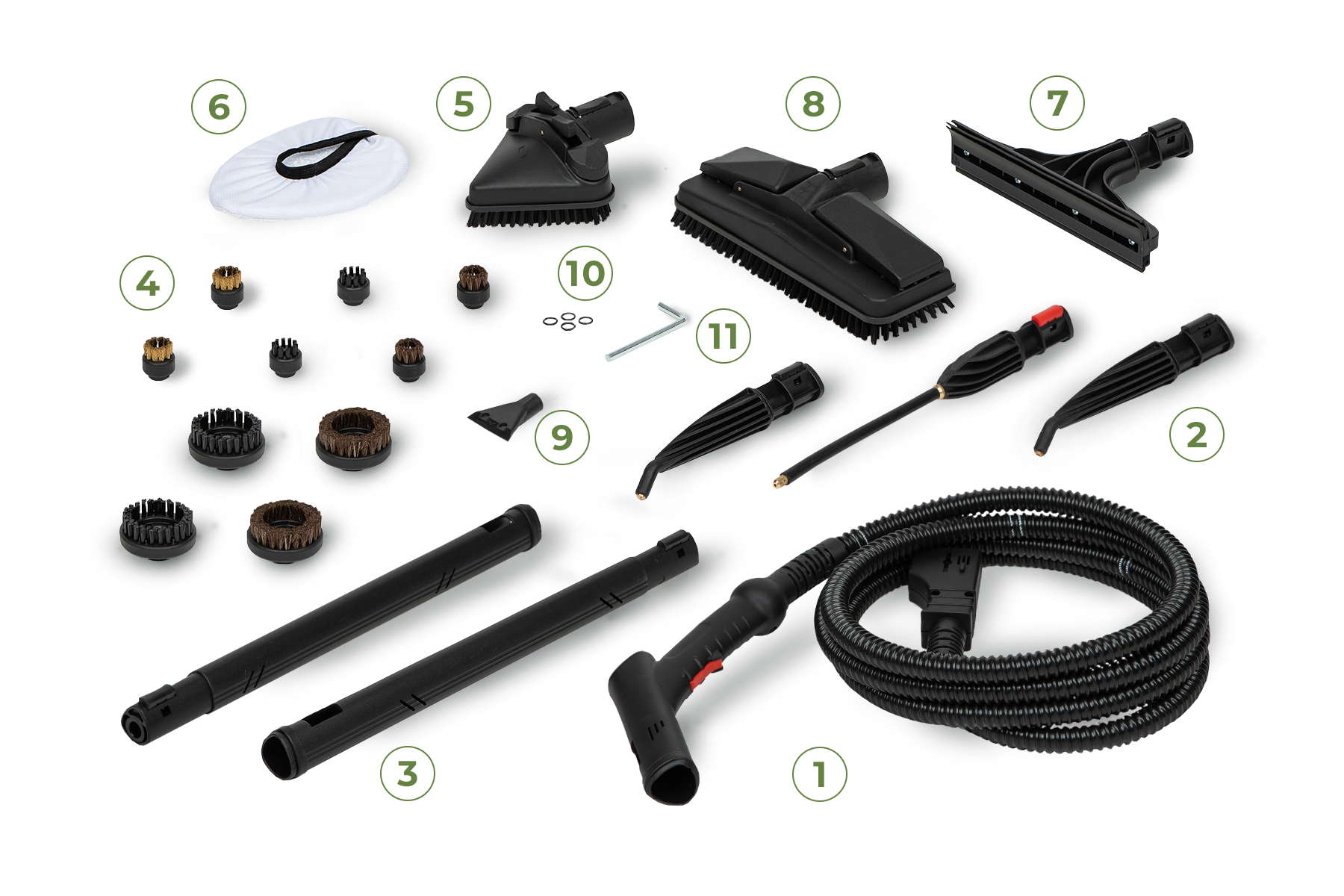 The Chief Steamer 155 arrives with a full complement of professional-grade accessories, ensuring you are equipped for any cleaning challenge right out of the box. The kit includes a variety of nozzles for concentrated power, extension wands for extended reach, and a comprehensive set of brushes—including heavy-duty brass brushes for aggressively scrubbing baked-on carbon from commercial grills and ovens without degradation.